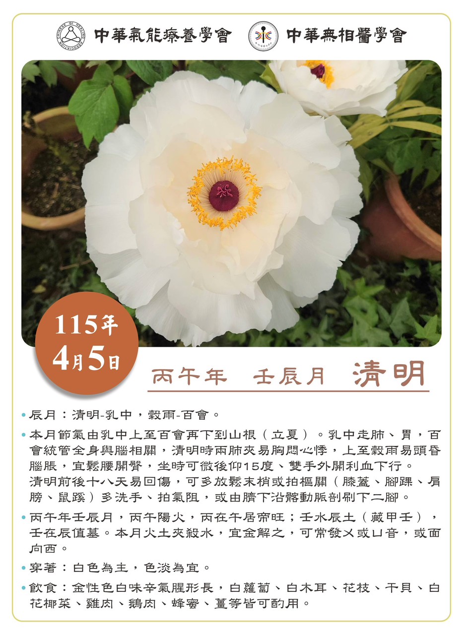 .辰月:清明-乳中,穀雨-百會。 .本月節氣由乳中上至百會再下到山根(立夏)。乳中走肺、胃,百會統管全身與腦相闢,清明時兩肺夾易胸悶心悸,上至穀雨易頭昏腦脹,宜鬆腰開臀,坐時可微後仰15度、雙手外開利血下行。清明前後十八天易回傷,可多放鬆末梢或拍樞關(膝蓋、腳踝、肩膀、鼠蹊)多洗手、拍氣阻,或由臍下沿髂動脈剖刷下二腳。 .丙午年壬辰月,丙午陽火,丙在午居帝旺;壬水辰土(藏甲壬),壬在辰值墓。本月火土夾殺水,宜金解之,可常發ㄨ或ㄩ音,或面向西。 .穿著:白色為主,色淡為宜。 .飲食:金性色白味辛氣腥形長,白蘿蔔、白木耳、花枝、干貝、白花椰菜、雞肉、鵝肉、蜂蜜、薑等皆可酌用。
